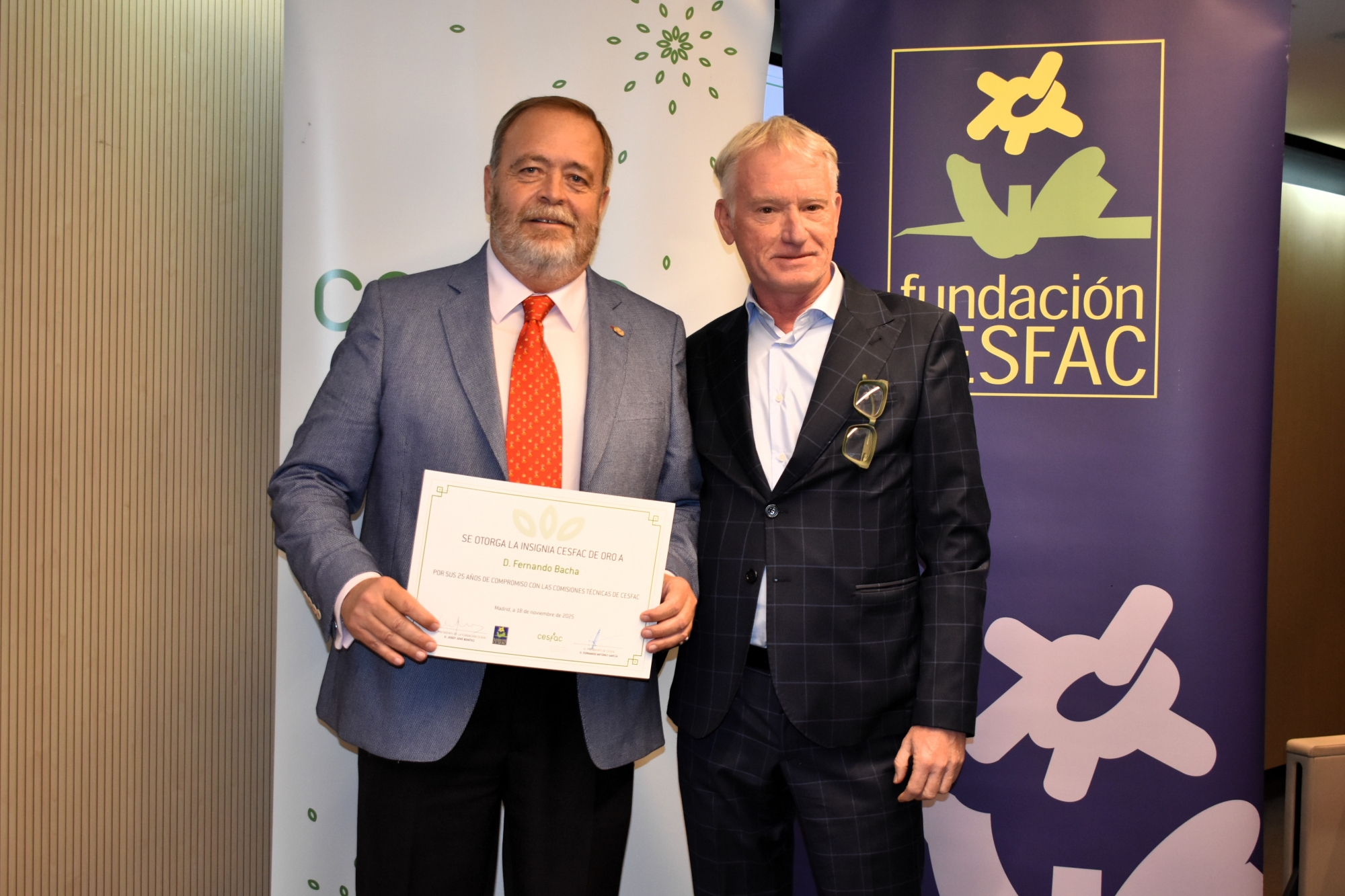 Durante el acto también se ha hecho entrega de la Insignia de Oro de CESFAC a Fernando Bacha, director técnico de la compañía Nacoop, en reconocimiento a sus 25 años de compromiso con las Comisiones Técnicas de CESFAC.